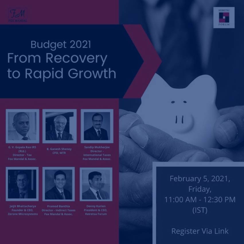 News In association with Keiretsu Forum, Fox Mandal is organizing an event to deliberate on impact of Union Budget-2021. Apart from Budget analysis from the